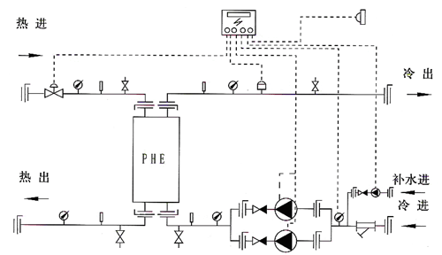 The automatic unattended on-site control heat exchanger unit has the function of manually controlling the heat exchanger unit. Besides, the primary network is equipped with an electric regulating valve, which controls the water supply temperature of the secondary network and has the function of outdoor temperature compensation. The circulating pump adopts frequency conversion control, and the water pressure difference of the secondary network is used as the feedback signal. The secondary network is controlled by variables, and the water pump is supplemented by frequency conversion. According to the water pressure difference of the secondary network, it is used as the feedback signal. All water pumps, electric regulating valves, water supply temperature of secondary network, etc. are fully controlled by the controller, and the controller can control the program to automatically start and stop the unit and restart it after power recovery. A water tank level sensor is connected to the controller to automatically control the water level of the water tank. But also has that function of wat shortage protection and water pump prevention; Secondary network return pipeline is equipped with loading and unloading pressure device. Under normal circumstances, the unit is in unattended and automatic operation state, and only the staff need to conduct regular inspections.