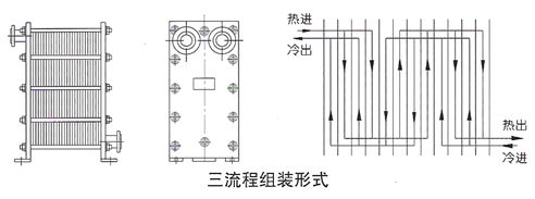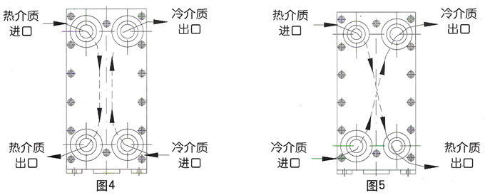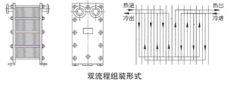 According to the temperature difference and flow rate of medium, plate heat exchanger can be assembled into single-flow, double-flow, three-flow and multi-flow forms. Single process means that the medium flows through one process in the heat exchanger, and double process means that the medium turns back and flows through two processes in the heat exchanger, and so on. The outline diagram of each process and its schematic diagram are shown in Figure 3. When multiple processes are adopted, the four interfaces of the heat exchanger cannot be located on the same clamping plate, and the inlet and outlet should be located on the front and rear clamping plates.